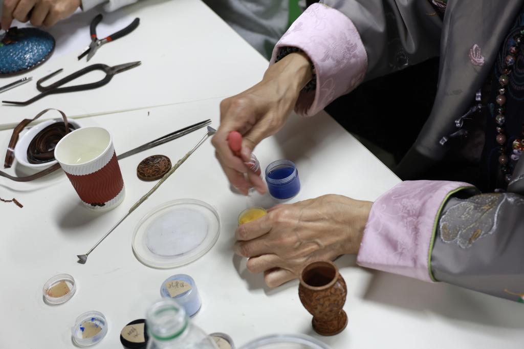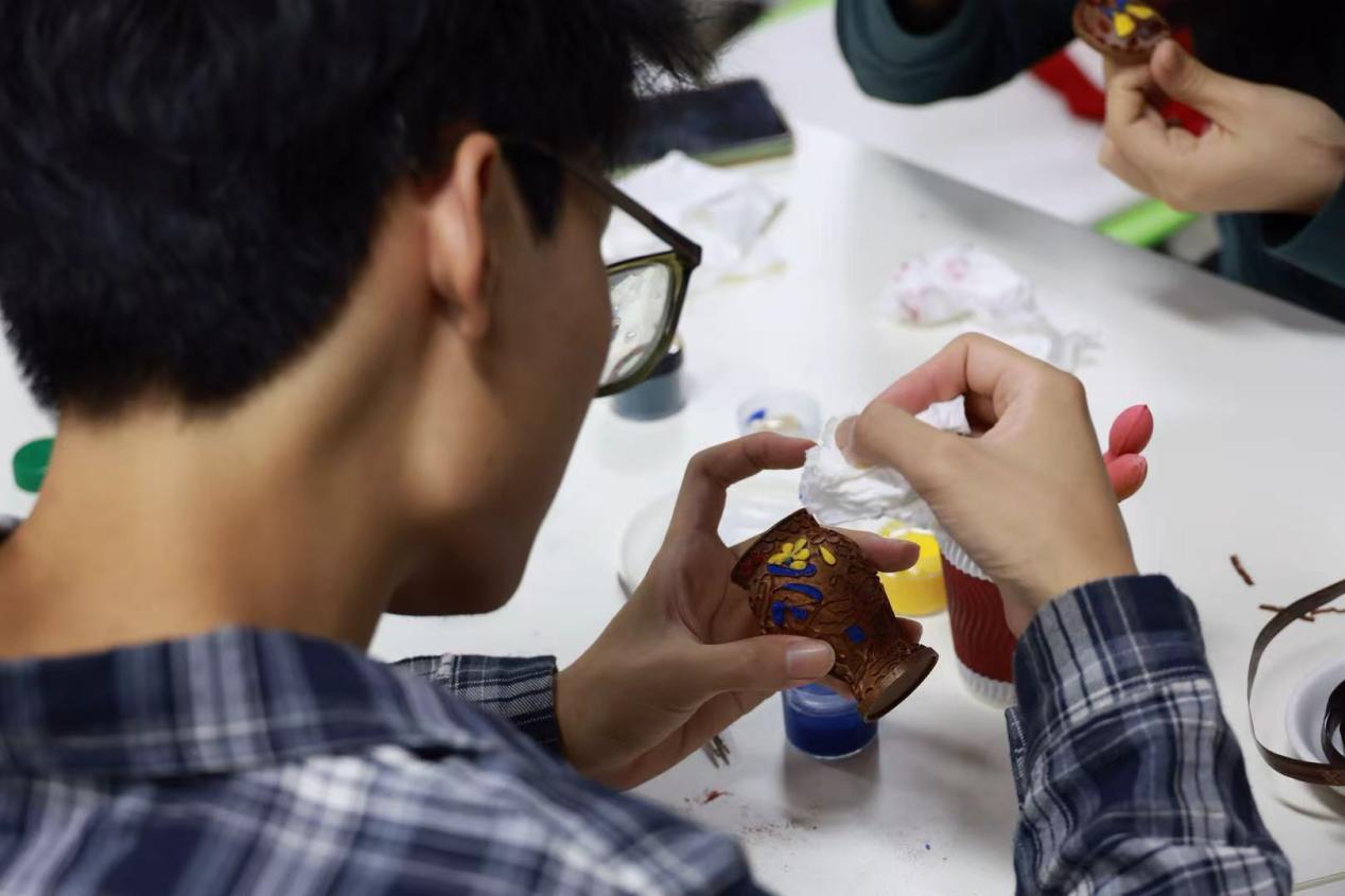 点蓝体验环节同步开展,专家先是详细拆解珐琅釉料的色彩搭配逻辑与填充核心技巧,通过实物展示不同釉料的融合效果,随后将调配就绪的红、蓝、绿等多种釉料及点蓝针分发给现场同学,引导大家在自己完成的掐丝花纹空隙中均匀填釉,沉浸式体验“色随釉落、彩随心动”的传统创作乐趣。