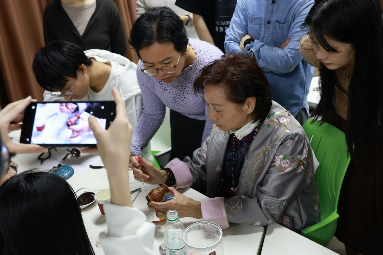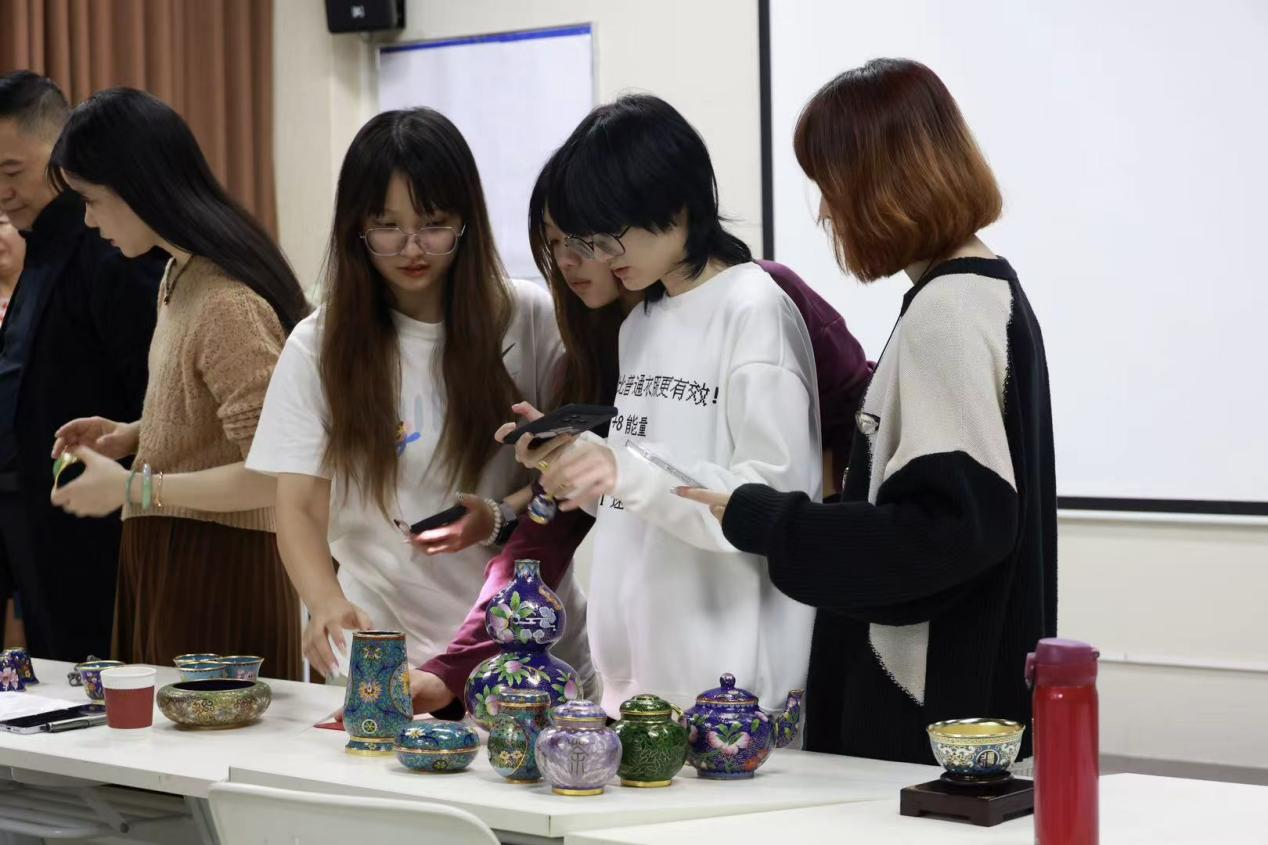 同学们在胡淑兰的一对一指导下,耐心完成掐丝、点蓝全流程操作,亲手打造出小型景泰蓝半成品,直观感受传统技艺的严谨与灵动。