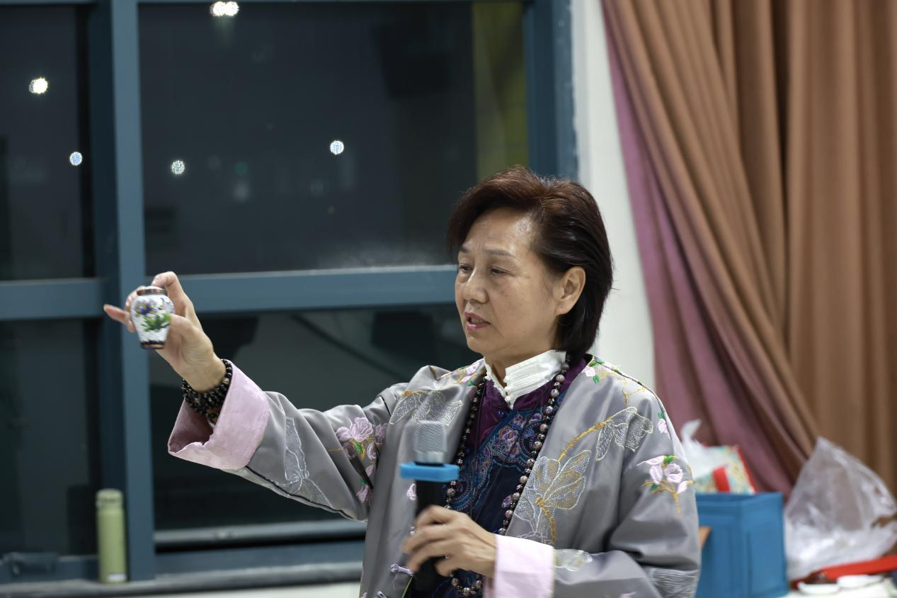 活动中,胡淑兰围绕景泰蓝这一“燕京八绝”传统工艺展开系统分享:从其元代发端、明清鼎盛的传承脉络切入,结合现场展示的景泰蓝创新方瓶(瓶身融合现代城市景观与传统纹样),逐一拆解制胎、掐丝、点蓝、烧蓝、磨光、镀金等核心工序的技艺精髓,通过实物细节展示,生动诠释传统匠人“一器千锤、一釉万染”的工艺坚守。