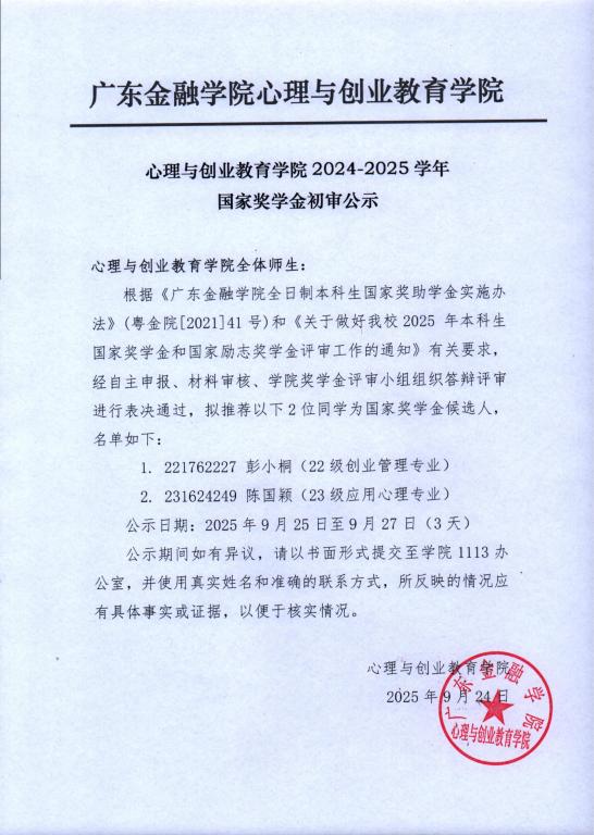 心理与创业教育学院2024-2025学年国家奖学金初审公示